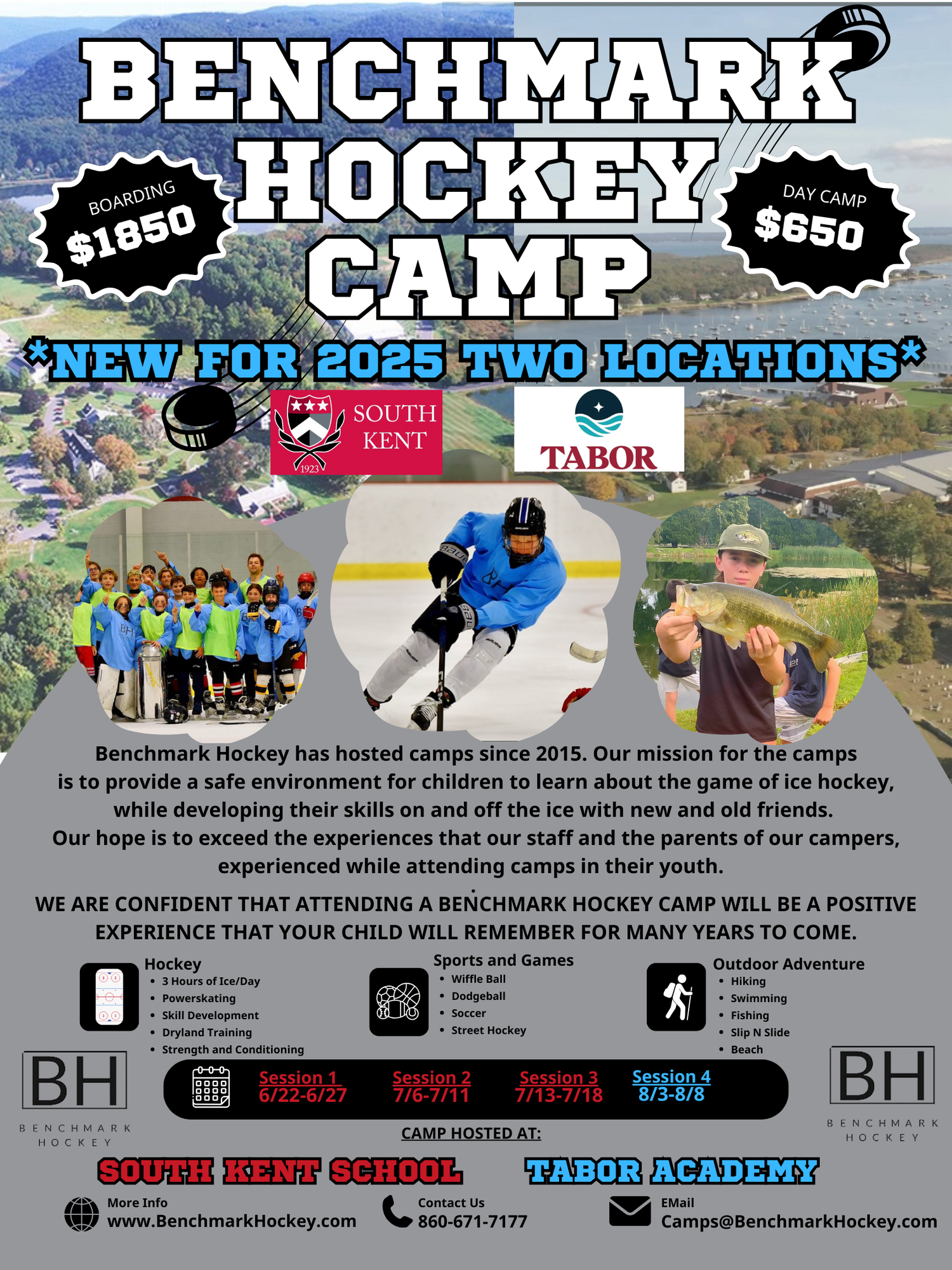 Benchmark Hockey is hosting four weeks of five-day camps. The first three weeks will be hosted at the South Kent School. Our new fourth session will be held at the oceanfront Tabor Academy in Marion, MA. The goal of the camp is to provide boys and girls to develop their hockey skills on and off the ice, with coaches who have coached at the youth, junior, collegiate (NCAA Division 1 and 3), and professional level.